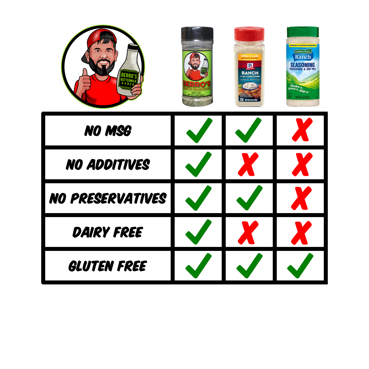 Add 1 tablespoon of Berro's Ranch Seasoning to 1 cup of mayo and 1 cup of buttermilk mix all ingredients well, cover and refrigerate for 30 mins to thicken or overnight for best results. Makes (12) 16oz bottles of Berro's Ranch. (Keep refrigerated) (Best by expiration date of buttermilk used)